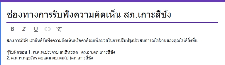 ชื่อหน่วยงาน : สถานีตำรวจภูธรเกาะสีชัง ที่อยู่ : เลขที่ 41 หมู่ 4 ตำบลท่าเทววงษ์ อำเภอเกาะสีชัง จังหวัดชลบุรี 20120 หมายเลขโทรศัพท์ : 0 3821 6218 , 0 3821 6219 E-mail : sorporkohsrichang@gmail.com , kohsrichang@police.p2.go.th Facebook Fanpage : สถานีตำรวจภูธรเกาะสีชัง จังหวัดชลบุรี
